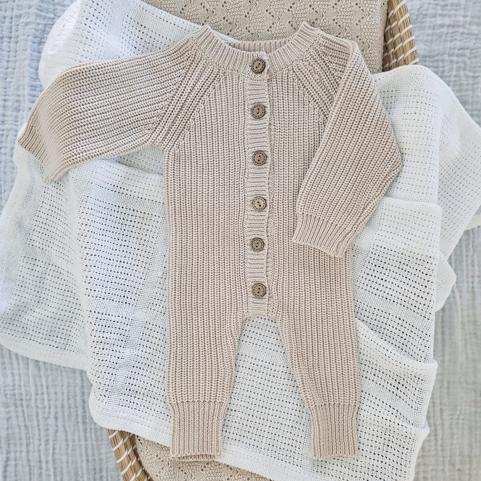 Keep your little one warm and cozy with our 100% cotton chunky knitted body suits. Our unisex bodysuits feature thick cuffs designed to be folded where required and are an essential addition to any wardrobe. These stylish bodysuits with wooden buttons help keep your little love comfortable and cozy from newborn to 3 months.