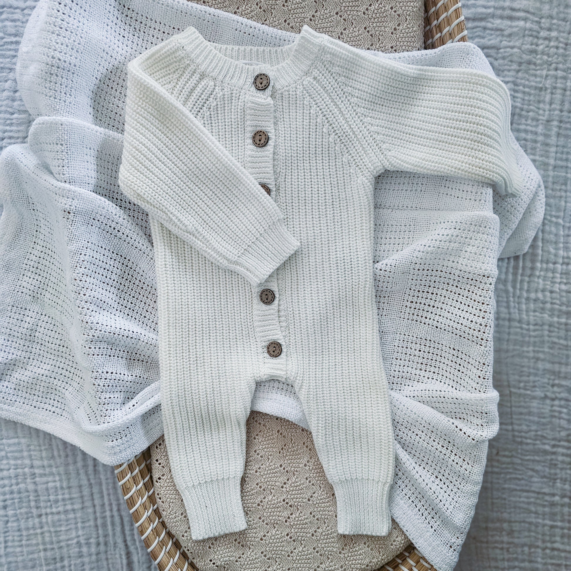 Keep your little one warm and cozy with our 100% cotton chunky knitted body suits. Our unisex bodysuits feature thick cuffs designed to be folded where required and are an essential addition to any wardrobe. These stylish bodysuits with wooden buttons help keep your little love comfortable and cozy from newborn to 3 months.